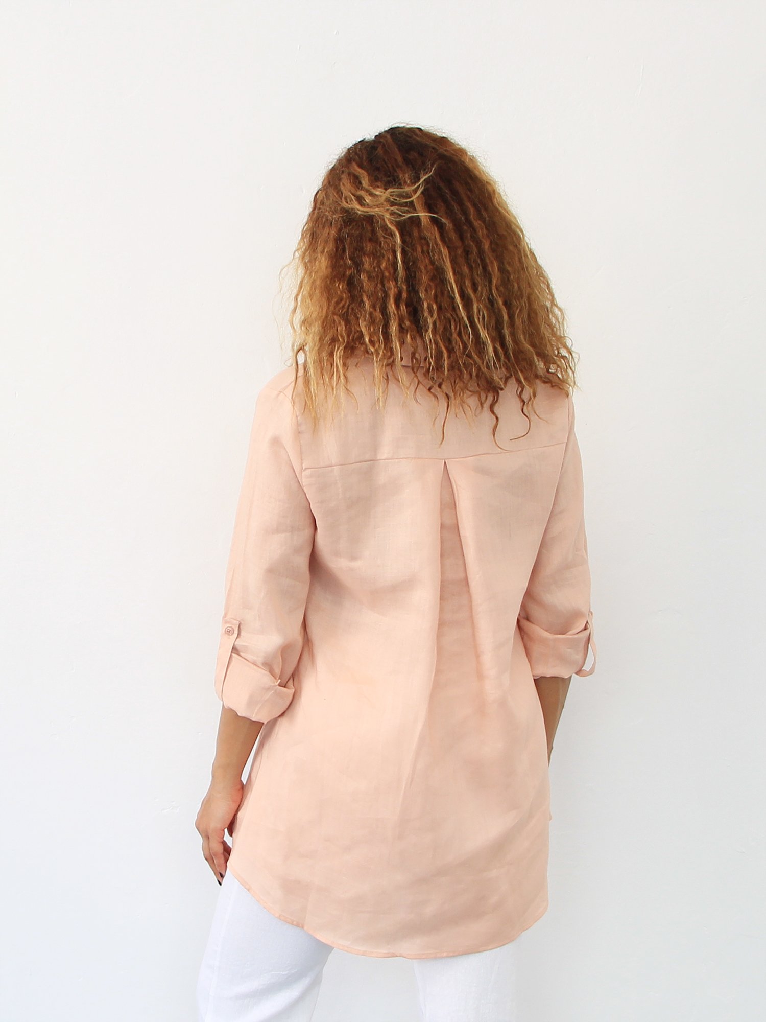 Our linen button up is the perfect top to help you stay stylish and professional in the warmer summer months. The light linen material is breathable and offers a comfort unparalleled by other fabrics. Available in Peachy Keen.